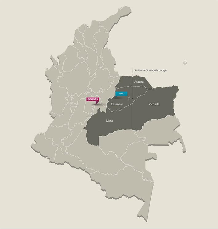 La región de Orinoquía es una de las cinco regiones naturales de Colombia más complejas y extensas en biodiversidad que pertenece a la cuenca del río Orinoco, también conocido como los Llanos Orientales. Consta de vastas sabanas e innumerables humedales con una incalculable riqueza teje una gran red desde la cordillera hasta las llanuras con un área de 285,437 km cuadrados a 350 m.s.n.m.